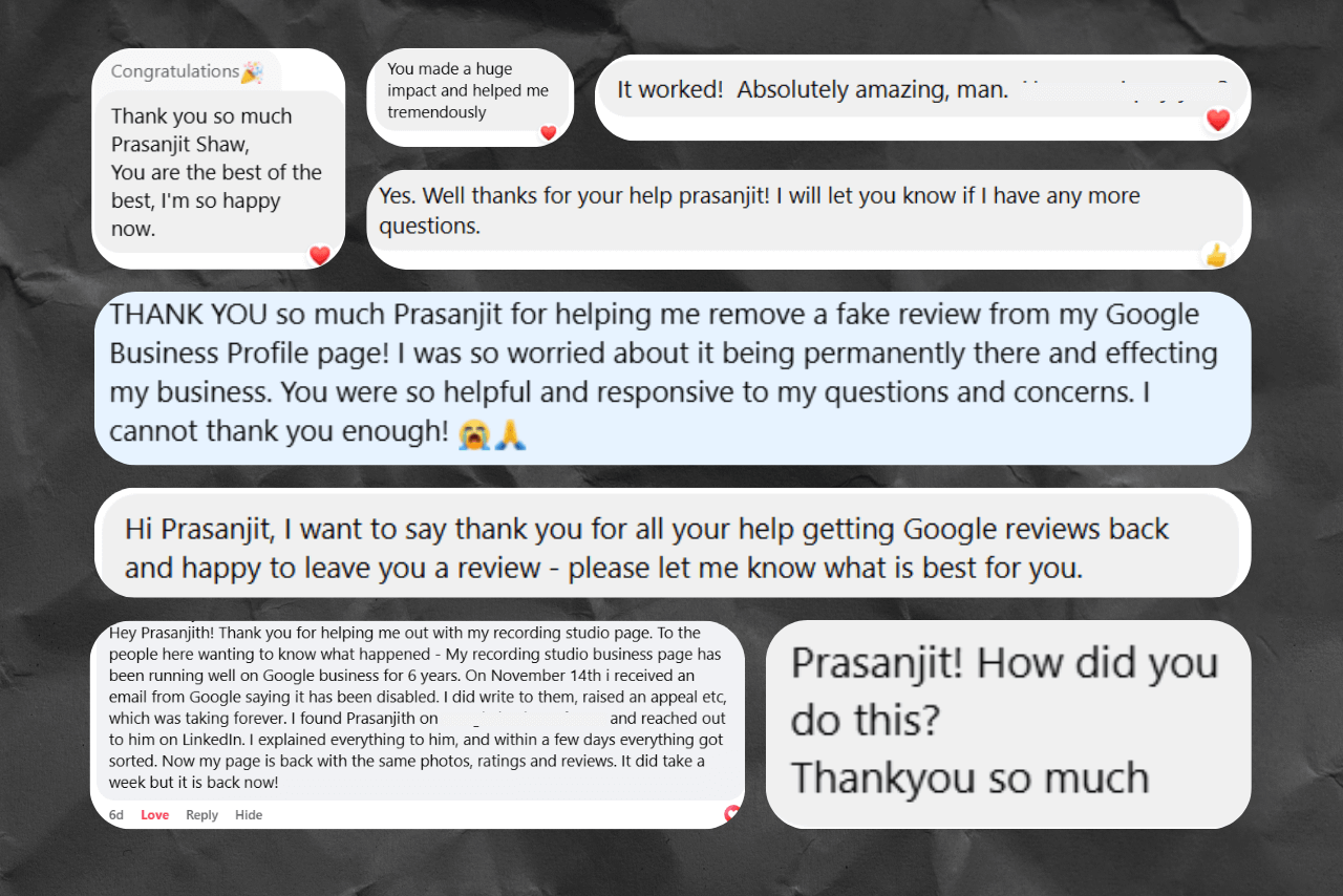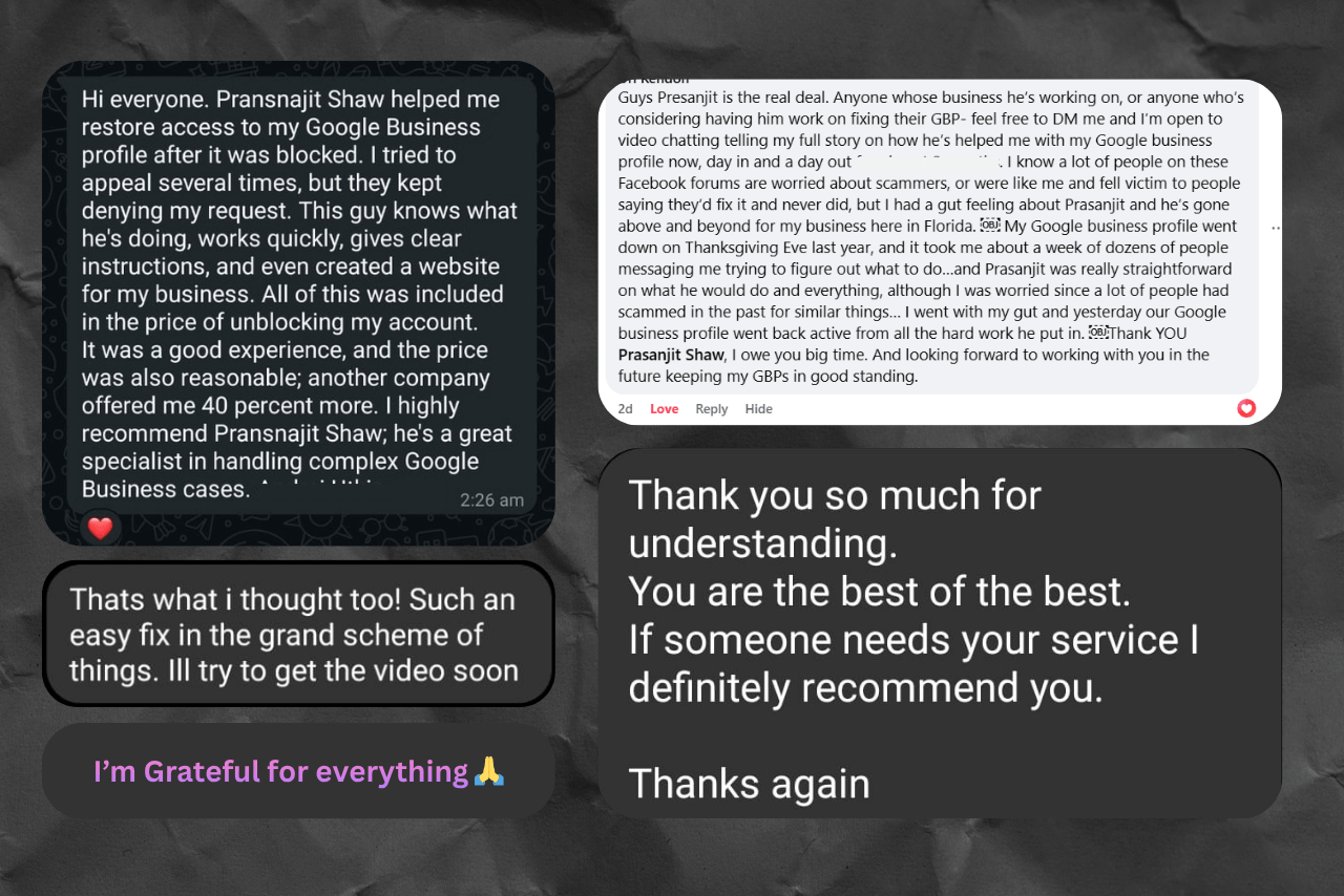 Context matters. My success rate is 100% for legitimate businesses that haven't committed violations Google will never forgive (like confirmed spam networks or fraudulent activity). I carefully evaluate every case before taking it on. If Google's support has explicitly told you your listing was involved in activities that make recovery impossible, I'll tell you upfront that I can't help—I won't take your money for false hope. But if you're a real business with real documentation and a genuine violation that can be corrected, I haven't failed yet. And I am grateful for this.